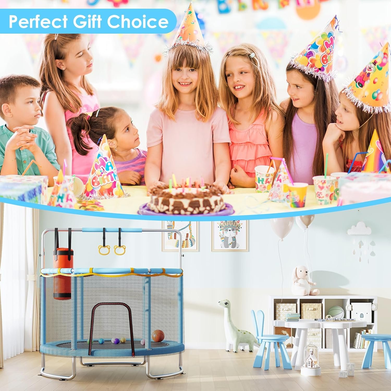 Materials: Anti-rust steel frame, high-resilience jumping mat, PE safety net